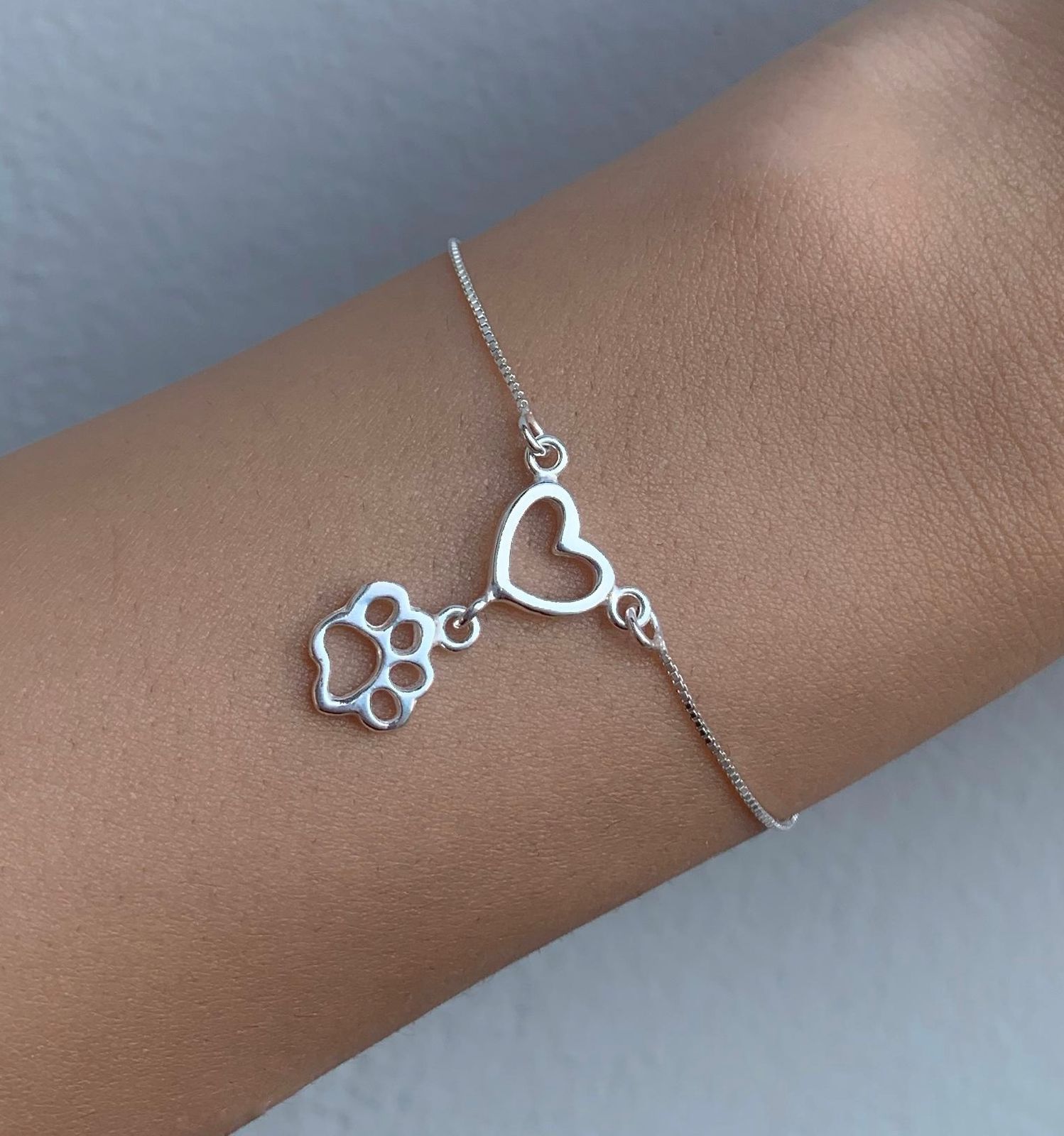 Pulseira de prata 925 coração vazado e patinha.